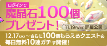 期間中ログインするだけで魔晶石100個をもらうことができる。リセマラにも最適なので、この機会を逃さないようログインしておこう。