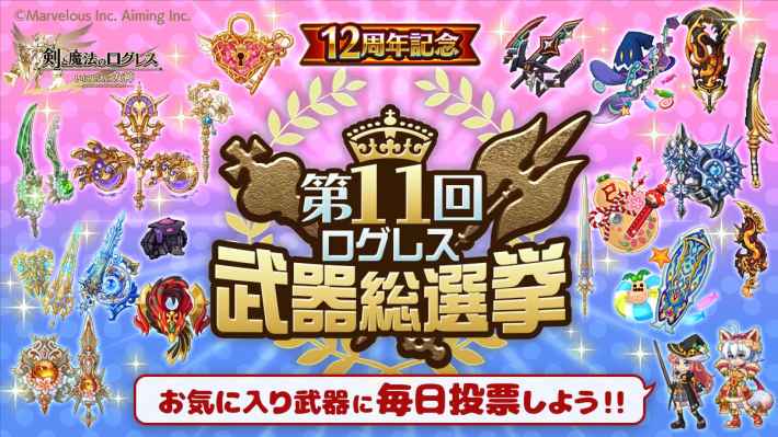 12周年を記念して第11回武器総選挙が開催される。総選挙で上位人気となった武器は後日ガチャでピックアップされるため、欲しい武器に投票しよう!