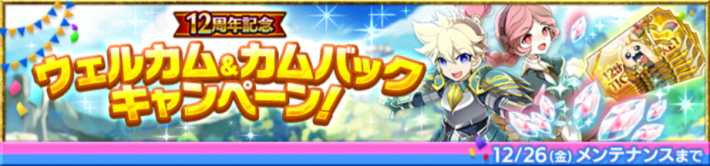 | 配布アイテム | ・魔晶石50個 ・12周年記念ガチャチケット100枚 |